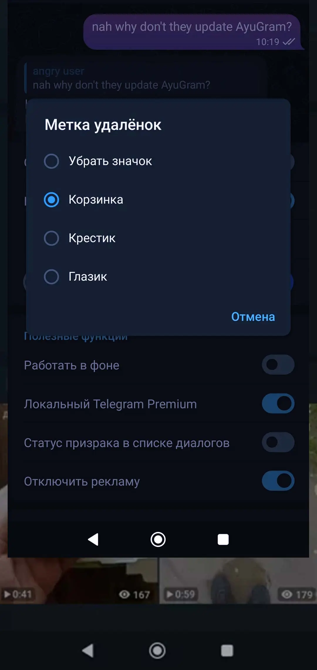 Augram — это расширенная версия популярного мессенджера Telegram с уникальными функциями для приватности и контроля. Приложение позволяет просматривать удаленные сообщения, скрывать онлайн-статус, делать скриншоты, фильтровать сообщения, получать доступ к эксклюзивным инструментам без подписки.